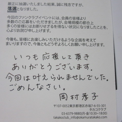 岡村孝子 2017/04/15 『T's GARDEN』公開収録観覧 抽選結果 今日夕方届きました(^^)/~~~ 結果は (^^)/~~~ 正直落選で、ホッとしている。何の用意も、心づもりももしていない。 このメッセージの方が『お宝』かもしれない(^_^)v PR