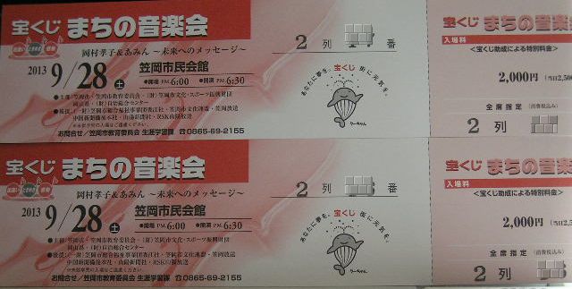 岡村孝子 2013/08/03 まち音 笠岡のチケット届く 大阪へ行こうとしていたら、郵便屋さんが、、、。いつもは不在票の残ってる事ばかり。届いた先は笠岡教育委員会。先日のチケットの配布先とすぐわかる。座席の位置もわかってる。久々の良席であみんを楽しみます(^v^) アクセス急増中(^v^)でも記事はまだですよ(-。-)y-゜゜゜ PR