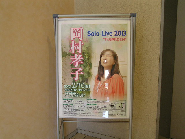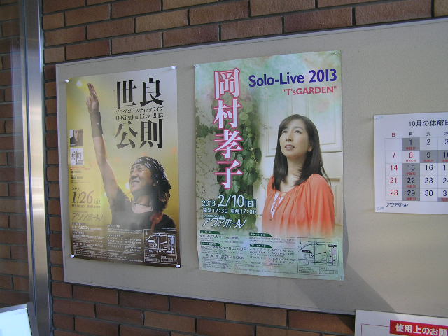 岡村孝子 2012/10/07 アクアホール友の会入会 来年の2月の岡村孝子さんのライブのための、最初のステップ。 アクアホール友の会の手続きに行って来ました。 友の会のチケット販売が迫ってるので、早めの手続きです。 タカコクラブでの手続きも10月9日ですが、今回は見送りました(^v^) 自宅から30分でアクアホール。 付近はなにもありません。といっても官庁街です。 市役所支所、消防署、某宗教団体の支所。 少し離れた所には、地元スーパーマーケット。 それ以外はのどかな田園風景です。 駐車場は他にも2箇所あります。 玄関ホール入口の掲示板には、 すでに孝子さんのポスターが既に貼られていました。 正直驚きました、思わずパチリ(^v^) となりは1月26日公演の世良公則さんのポスター。 ドアを開け、館内の正面のボードにも孝子さんのポスター。 前売りが迫ってるとはいえ、驚きです。 孝子さんのファンとしても、嬉しいですね。 これがそのアップ写真。 孝子ファンならご存じ、お決まりの最近のポーズ。 孝子さんの眼差しの先には、何があるのでしょう。 何を、いや誰を見つめているのでしょうね(^v^) 手続きはどこで、、、と見渡すと、孝子さんだけのポスター発見。 これまた、嬉しいですね(^v^) 写真を撮り終わり、入口付近に窓口を発見。 即手続きを済ませました。 また少しばかりの質問に快く返答して頂き感謝します。 これがそのカード。 裏面に、氏名と生年月日が入ってる。 これで当日を待つのみです。 ひたすら『待~つわ(^v^)』です。 本日8日、昨日に引き続きアクアホールへ訪問。 追加情報の蒐集です。 昨日の写真の撮り直し。 でもこうしてアップして気づいた(--〆) 玄関からの光線が写ってしまってる。 あぁ、何たること。 20日に撮り直そう(^v^) もう一枚ホールに掲示されてました。 二階へ上がり、喫茶『f シャープ』の前を過ぎ、館外へ。 そこは揖保川の堤防へ直結してました。 その渡りローカから、喫茶『f シャープ』を望む。 春は桜のトンネルを望めるロケーションです。 その揖保川の堤防の桜並木。 散策路になっていて、 おりしも親子連れの歓声が聞えていました。 ライブが終わり、春にもう一度来たいですね。 喫茶『』の内部。 奥へ長い造りになっていて、全面ガラス張りです。 眺望はバッチリです。 ただ喫茶店とあって、軽食のみの提供です。 コーヒー400円、軽食600~900円くらい。 レジ付近に孝子さんのチラシがありました。 思わず『孝子さんの事知ってます?』との問いに、 『???』です。 ファンとしては辛い思いでした。 過去のライブでは、ここは満席になるとのことです。 またチケットの発売日には、やはりホール玄関前には行列ができるそうです。 ホール玄関とは反対からの風景。 この部分がホールの本体になるのでしょうか。 ここで孝子さんに逢えるその日を、心待ちにしています。 今後色んな『声』が聞こえてきますが、 まあそんな事も今はスルーできるほどの、心の余裕ですね(^v^) PR