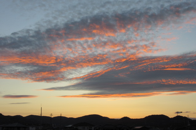 岡村孝子 2015/08/26 台風一過の夕暮れ ここ西幡は被害もなく、台風は北上しました。河川敷に佇み、昨日までと違った風が、頬に快い。昼間どんよりと曇っていたれけど、日没が近づくとともに秋晴れになりました。そして眩しい夕陽が山の向こうに沈むとともに、雲が黄金色に焼けました。刻々と変えてるその姿を、レンズ越しにジッと見つめてる間もなく、シッターを切り続けました。ホンの数分の出来事ですが、それゆえ見事です。やはり台風のあとだけに、空気が違います。数日前鳴いていたセミもどこへやら、トンボの群れが時折かすめます。こうして夕景を眺め潮風に吹かれてると、疲れも心も少しは癒されます。 いよいよ明後日の今頃はJRに身を委ねている頃です。そして明々後日には、この夕景より素敵な孝子さんに再会できます ❤ PR