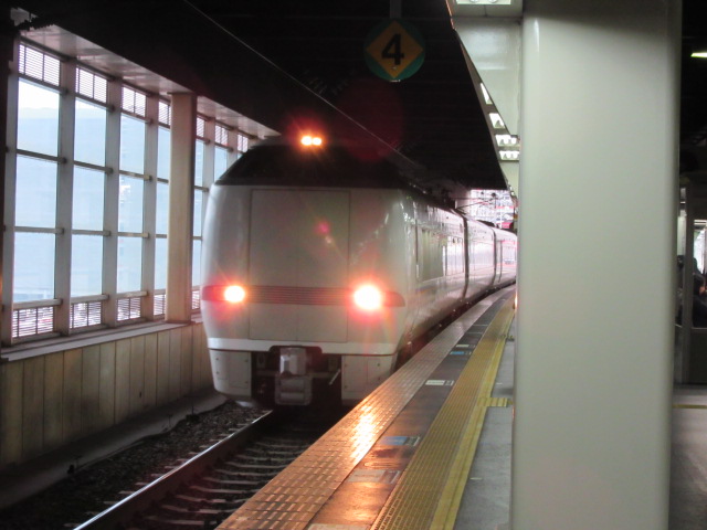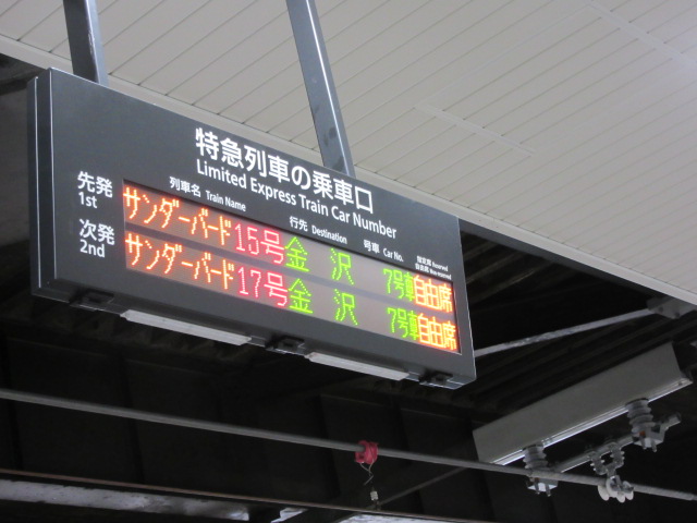 | ダメ元で午前中最後のサンダーバードに予約を入れ、 その前のものに乗れればとの思いで新大阪に着くと、 以外と空いていたので予約していた前のサンダーバードの自由席に飛び乗った。 ここから2時間40分の旅である。 |