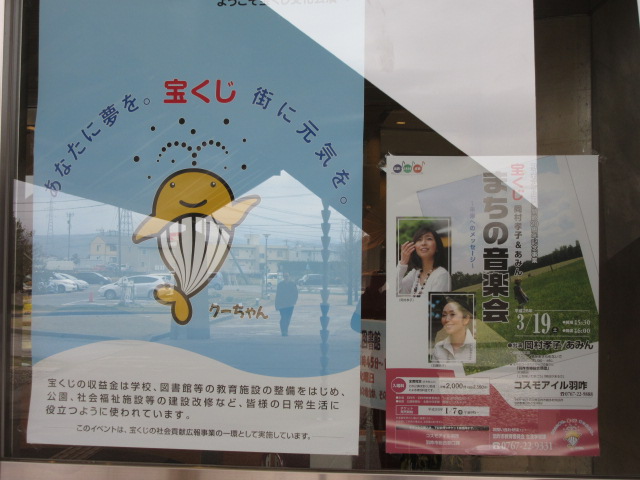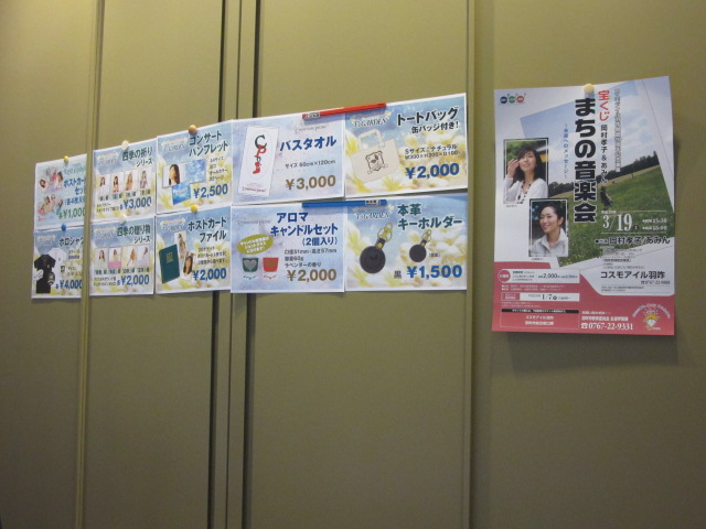 | 会館入り口のポスターなどは当たり前。 今回のライブでこんなの発見、この町の意欲が感じられます。 前売り券発売も、会場と市役所のみとの意気込み。 ファンとしてはチケットの確保が大変ですが、本来の形ですね。 |