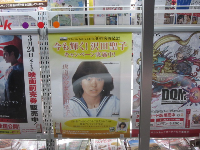 | ライブ後出待ちをしました。 しかし孝子さん、ハコさんはバスにスーと乗られてしまいました。 ファンとしては残念ですが、お二人ともお疲れだったのですね。 途中のコンビニの店内に貼られていた『沢田聖子さん』のポスター。 CD発売のお知らせです、ここで再会するとは何かの縁??? |