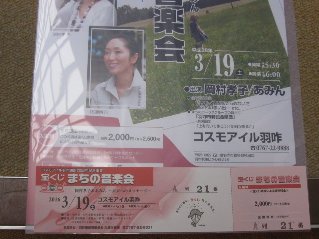 | これがそのチケットです。 孝子さん、ハコさんとファンを結ぶ一枚の小さな紙だけれど、 これが色んな思いを繋いでくれます。 苦労や優しさ、感謝と人の温かさ。 孝子さんのファンになって本当に良かった(^_-)-☆ |