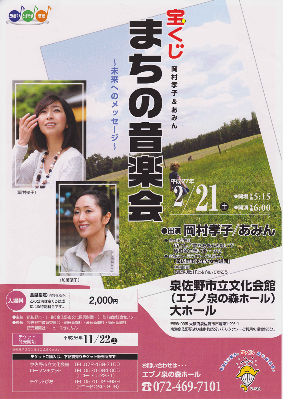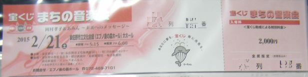 岡村孝子 2014/12/14 泉佐野 まち音チケット(^_-)-☆ ニタニタしています(^v^)だって年始早々孝子さんに、間近でお逢い出来きます。ファンなら当然ですね(^_-)-☆大阪で無事チケットを受け取り、ホッとしています。チケットの販売告知前からの、色んな事が思い出されます。現地へ行かなくても雨や寒波、トイレの心配などなど(^_-)-☆販売当日遠方から雪の中での移動や、車の扉が凍り付く寒さの中での会場入口での販売待ち。寝袋でも身も凍り付くそんな中、ホントお疲れ様でした。寒風より冷たい視線や遠吠えにも負けず、ガラスのかけらが心に刺さるような苦労の末の『一枚』だと思います。改めてお礼申し上げます、ありがとうございました。 先日の大阪で懐かしい作品たちに癒され、孝子さんから『感謝の気持ち』を受けました。孝子さんという素晴らしい方に巡り合い、温かい孝子ファンにも恵まれました。これからも孝子さんを中心に、時間も空間も飛び越えて、応援していきたいと思います。 PR