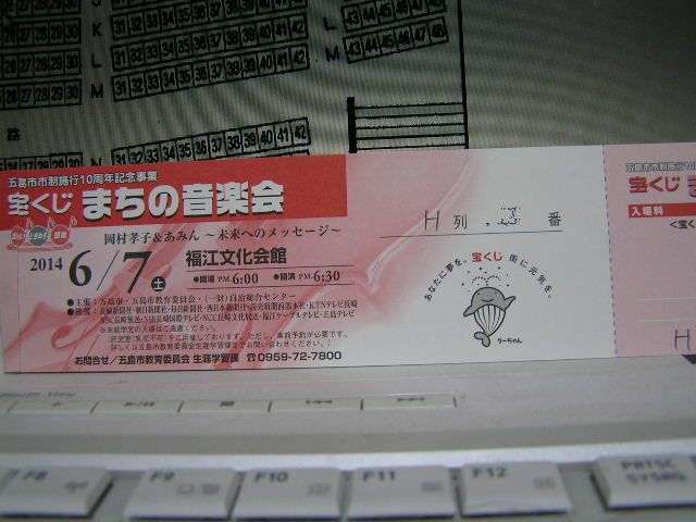 岡村孝子 2014/04/07 " 宝くじまちの音楽会 " 2014 チケット到着 (^-^) 西風に乗って、幸運の便りが届きました(^v^)『迷ったらやる』の孝子さんの影響と、昨年暮れのCPでのチケットが手元にない苛立ちを考えたら、精神衛生上申し込まずにはいられなかった。エイ、ヤーとばかり申し込んだチケットが、夕方届いていた(^_-)-☆座席はホールのど真ん中。落ち着いて観賞できる席である。熱狂ファンをたまには忘れ、あみんの世界に酔いしれるのもいいかも(^-^) 今後は前後の行動と、五島市での宿泊先などの確保。でも当日行けるかどうかは、限りなく0%に近い。 PR