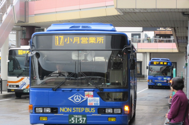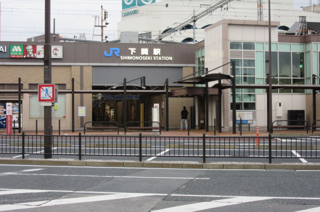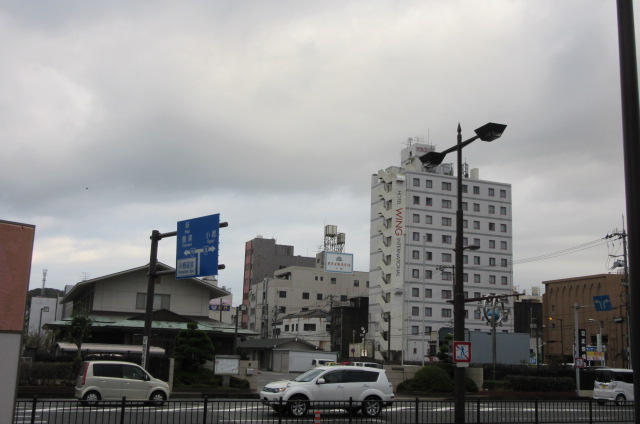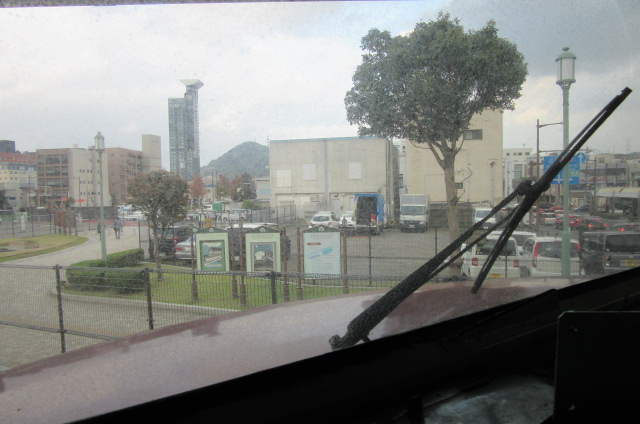 | ホテル側はいかにも裏口の雰囲気。雨がいつ降っても不思議でない雰囲気。9時前の小月行きに乗車。 |