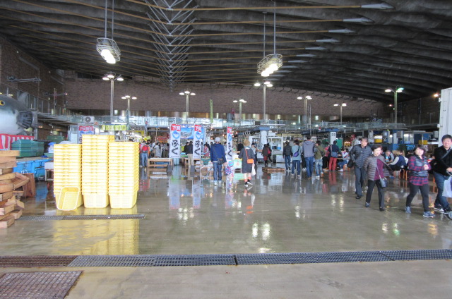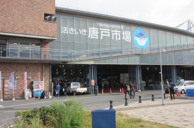 | 移動中幸い雨に降られずに唐戸市場へ。昨日と違い昼食時間は都会並みの混雑。人気店は長蛇の列。 |
