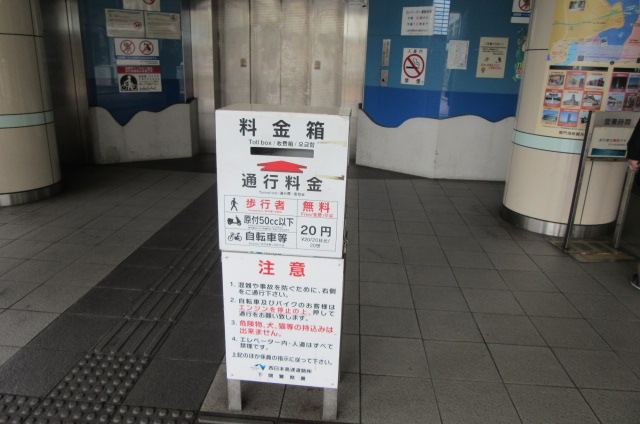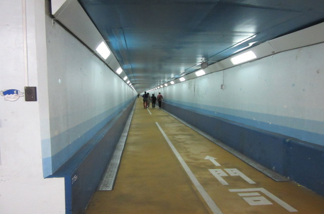 | 国道トンネルの下に780mの歩行者専用トンネルが無料。15分で門司めかりへ。対岸が先ほどの下関。 |