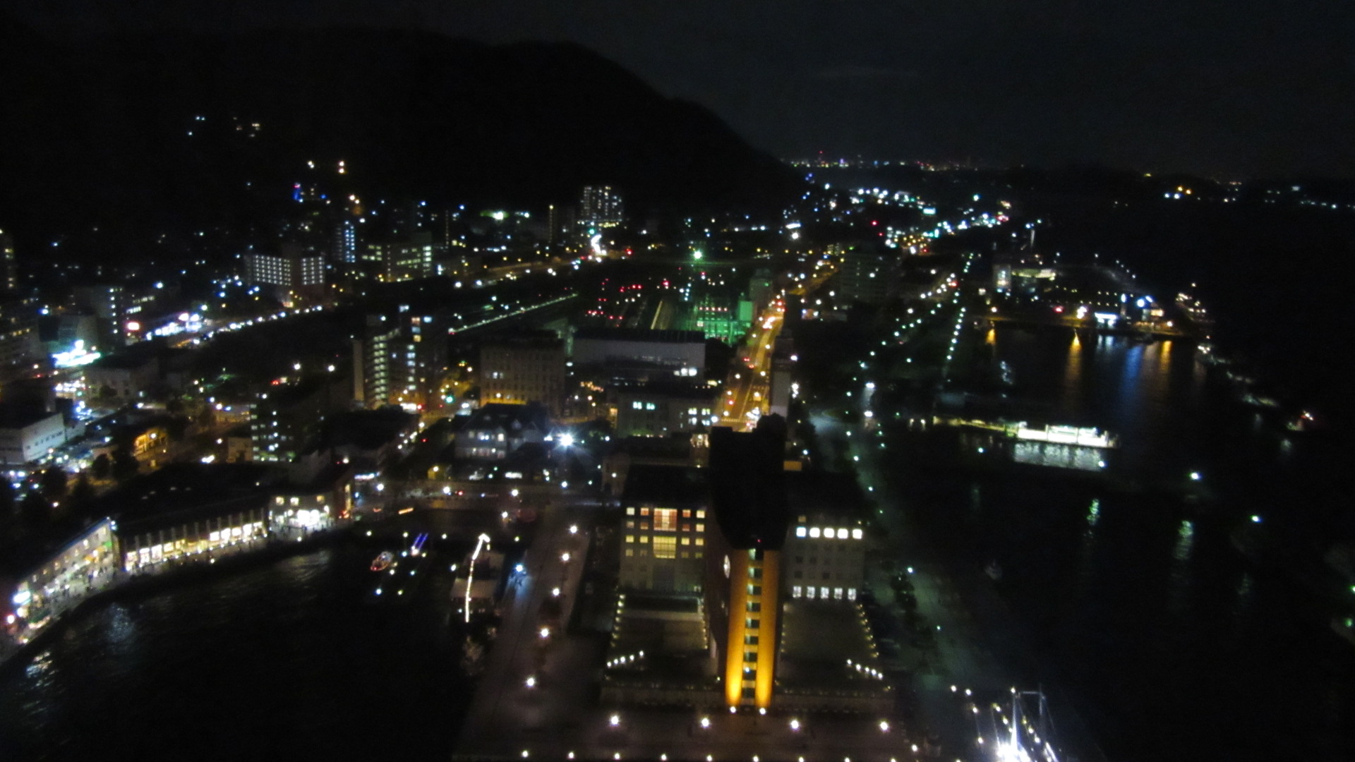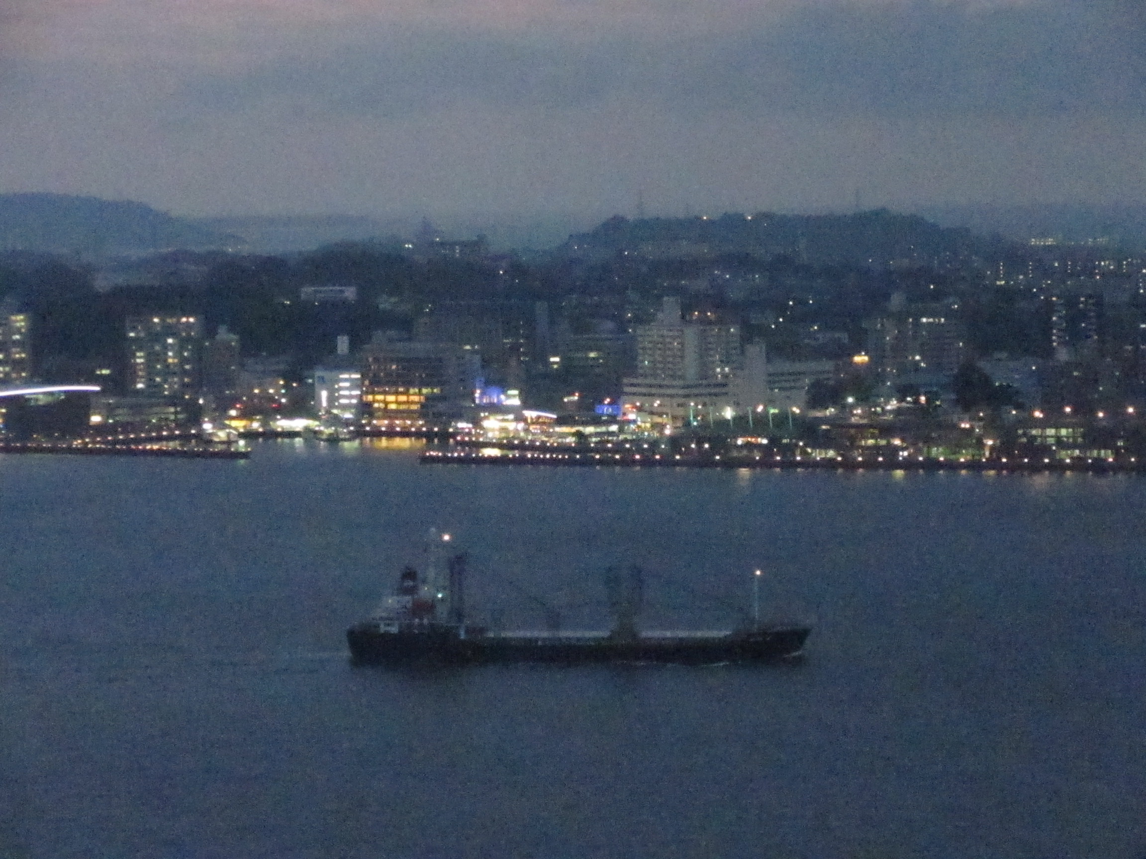 | 宵闇が迫り港の見える『門司港レトロ展望台』31階103mで、海峡を挟んで下関や大橋も見渡せます。 |