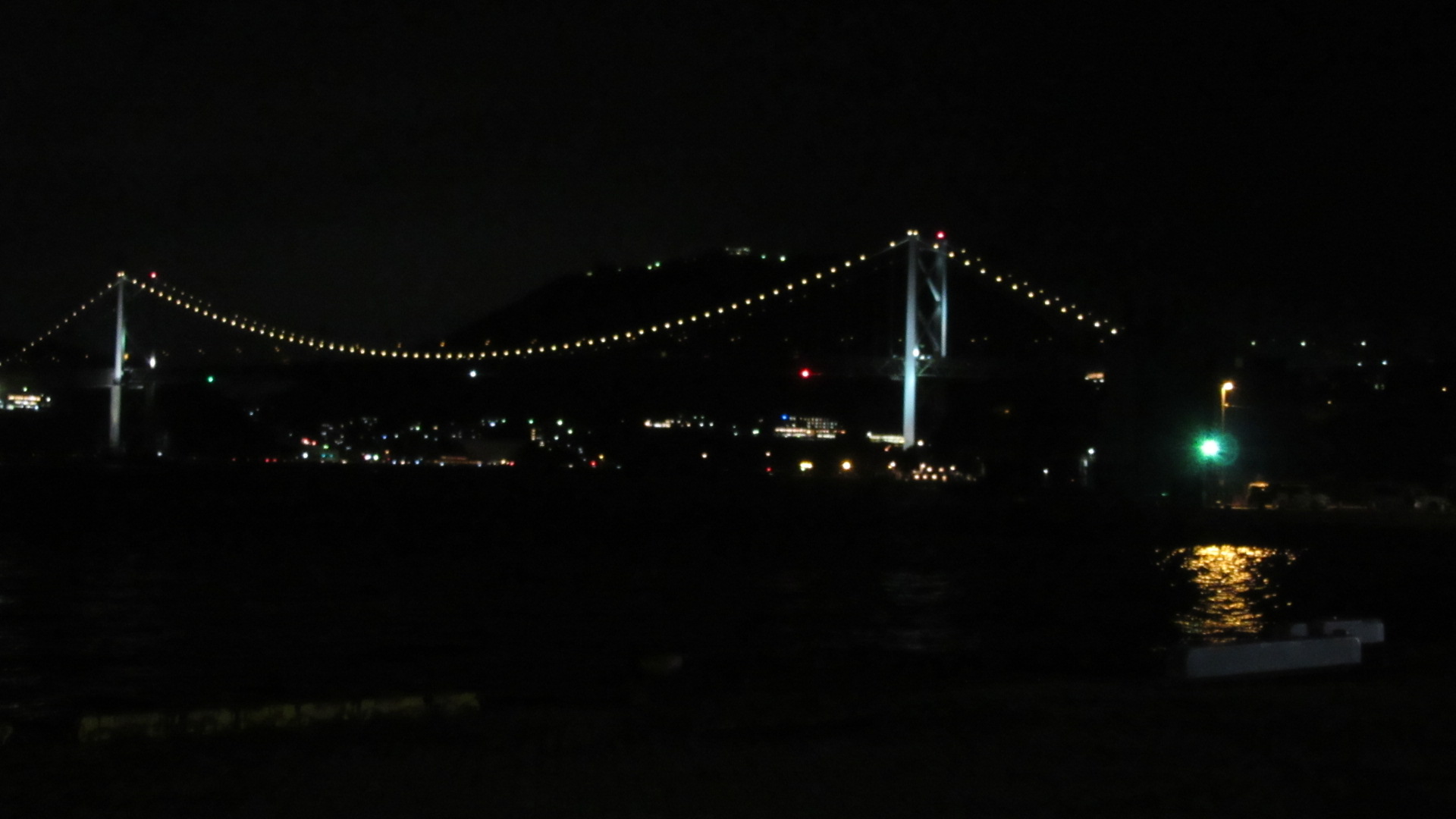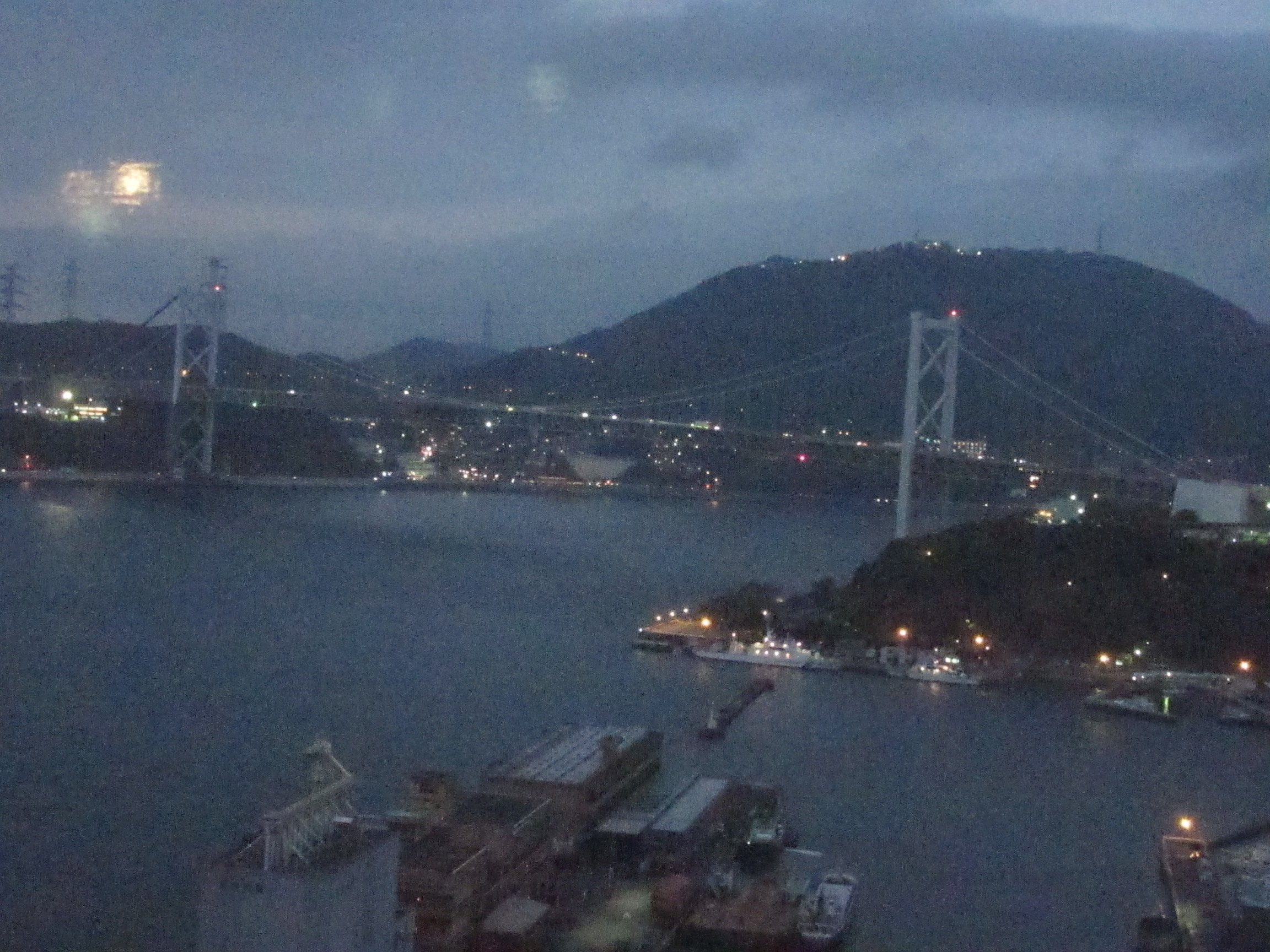 | 関門海峡大橋、遠景の下関、そして眼下のレトロ地区。ロマンチックな初日に立ち会えてラッキー。 |