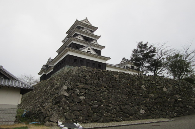 | その後松山道で大洲の町へ。『コロッケ』目当てだったけれど、途中挫折。町並み観光に変更。 定番の大洲城へ。駐車場前の桜と明治の町並み。 |