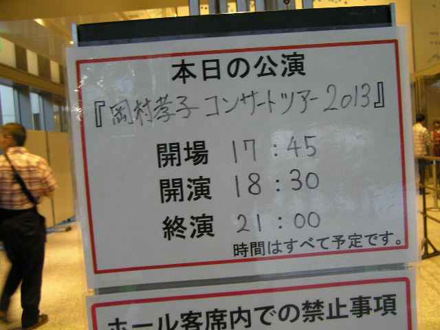 岡村孝子 2013/08/03 『T's GARDEN SPECIAL 大阪』 過去に何度か通った駅から数分の町並み。ここに立つと、会場入り口まで5分。心躍りますね(*^^)v前回は?と調べるとかなり昔です。孝子さんでは、来てませんでした(^v^)はたして誰? ここまで来ると会場の一角が見えてきます。以前と違うのは、『オリックス劇場』の看板でしょうか。手前の公園も少し小奇麗になってました。 入口の様子。以前はこの左にも建物が有り、それが中劇場とYHのはず。そしてこの中劇場も記憶の彼方に利用したような、、、。このガラス張りの建物の左には、今は不動産会社の建物。 着いた時にはもう開場していました。孝子さんのポスターや関連の電子掲示板を探しましたが、まったく見当たりません。ここへの道中にも一枚も張ってない。係員に訊くと、ホスターどころかチラシも無いという。こんな事初めてです。 今まさに始まろうとしているライブがわかるのは、この手書きの看板だけ。当然ライブ後のセットリストの掲示もありませんでした。 ロビーに入ると、見覚えのある有志一同の笑顔。しばしの孝子談義。僕以外はここでのライブでもう何か所目?!と、いう熱心なファンばかり。恐れ入りました(^v^) 席に付いてがっかり。高低差はなくステージも低く、全く孝子さんは見えず。孝子さんが傍に来ても、前の人の頭で見えず(^'^)『指差し』なんて縁のない席でしたが、楽しめました。 在りし日の大阪厚生年金会館。左の部分がない?ようです。 『大阪の孝子さんファン有志』が作成したうちわです。同封の注意書きにも、30年間孝子さんのファンとして、応援してこられた熱い思いが伝わって来ました。アンコール曲『ずっと』でニョロ、ニョロしてきました。ファンにとって想い出深く、またうちわは記念になりました。孝子さんにとっても想い出深い大阪になったと思います。『大阪の有志』の方、ありがとうございました。事前の各所への折衝、おつかれさまでした。 『ミンオン主催』ということでの盛り上がりの心配もなく、また恒例になってた『長ったらしい掛け声』や『プレゼントの輩』もなく、孝子さんとバンドと孝子ファンが奏でる『タカコワールド』に陶酔してきました。特に本編は『心の正座』で、静かに孝子さんの歌声やMCに聴き入っていました。また手拍子も完璧なくらい纏まっていました。これってファンクラブ100%じゃないかと思う位でした。『初めての人アンケートで70% ネットラジオ知ってる人は前から10列くらい』の状況で、よくこれだけ纏まってたと思います。心はひとつ、ってことですかね。孝子さんもそんな大阪の雰囲気が好きらしく、楽しまれている姿を見ていると、こちらも嬉しくなりました。またあるファンの方は、孝子さんのMC一言一言に頷いていたり、ハンカチで目頭を押さえたり。席の位置が悪い分、孝子さんの曲やMCに耳を傾けたり、会場のあちこちの様子を楽しむというメリットもありました。当然『身体ホグシコーナー』や『虹追い』などでは手だけでなく、肩まで痛くなるほど応援してきました。大阪独特のチャチャも短く的確で、ライブの進行を妨げない小気味良さもたまりませんね。しかし座席の位置の悪さで今回は孝子さんとのアイコンタクトも、当然孝子さんからの『指差され』もありませんでした。しかしそんな事より孝子さんが、『大阪はイイ所だよ』とか、『大阪って不思議で魅力的、もっと行ってみたい』なんて感じてもらったら、ファンとしてこんな嬉しい事はありません。『あなたにめぐりあう旅』の歌詞のように、わが故郷 姫路でもお待ちしています。~知らない景色がある いつかは出会うあなたが そこに待っている~ 時間の関係で出待ちも出来ませんでした。ライブ後道すがら、たつののライブの時のファンの方と孝子談義に興じた事は、ファンとしては何にも代えがたい幸せな時間ですね。共感する事、新しい発見など時間はいくらあっても足りませんね。 3階の両サイドまでお客さんが入り、平日としては『大入り』でした。その事はMCで孝子さんも仰ってましたね。この会場をこれだけ埋めるのは、やはり孝子さんの魅力と、『ミンオン』さんの組織力のお陰ですね。ファンとしても心行くまで楽しめました。孝子さん、ありがとうございました。またのご来坂、お待ちしています。 次回は『港の見える街』でお会いしましょう。 セットリスト 1.どんどん 2.四葉のクローバー 3.電車 4.勇気 ~courage~ 5.forever 6.ありがとう 7.大切な人<休憩><アコースティック> 8.はぐれそうな天使 9.ふるさとにて10.あしたの歌11.運命なら・・・12.NO RAIN,NO RAINBOW<身体ホグシコーナー>13.adieu14.星屑に願いを15.あなたにめぐりあう旅<アンコール>16.夢をあきらめないで17.ずっと18.虹を追いかけて お会いする日を楽しみにしています(^v^) シアワセ ユキ つづきはこちら