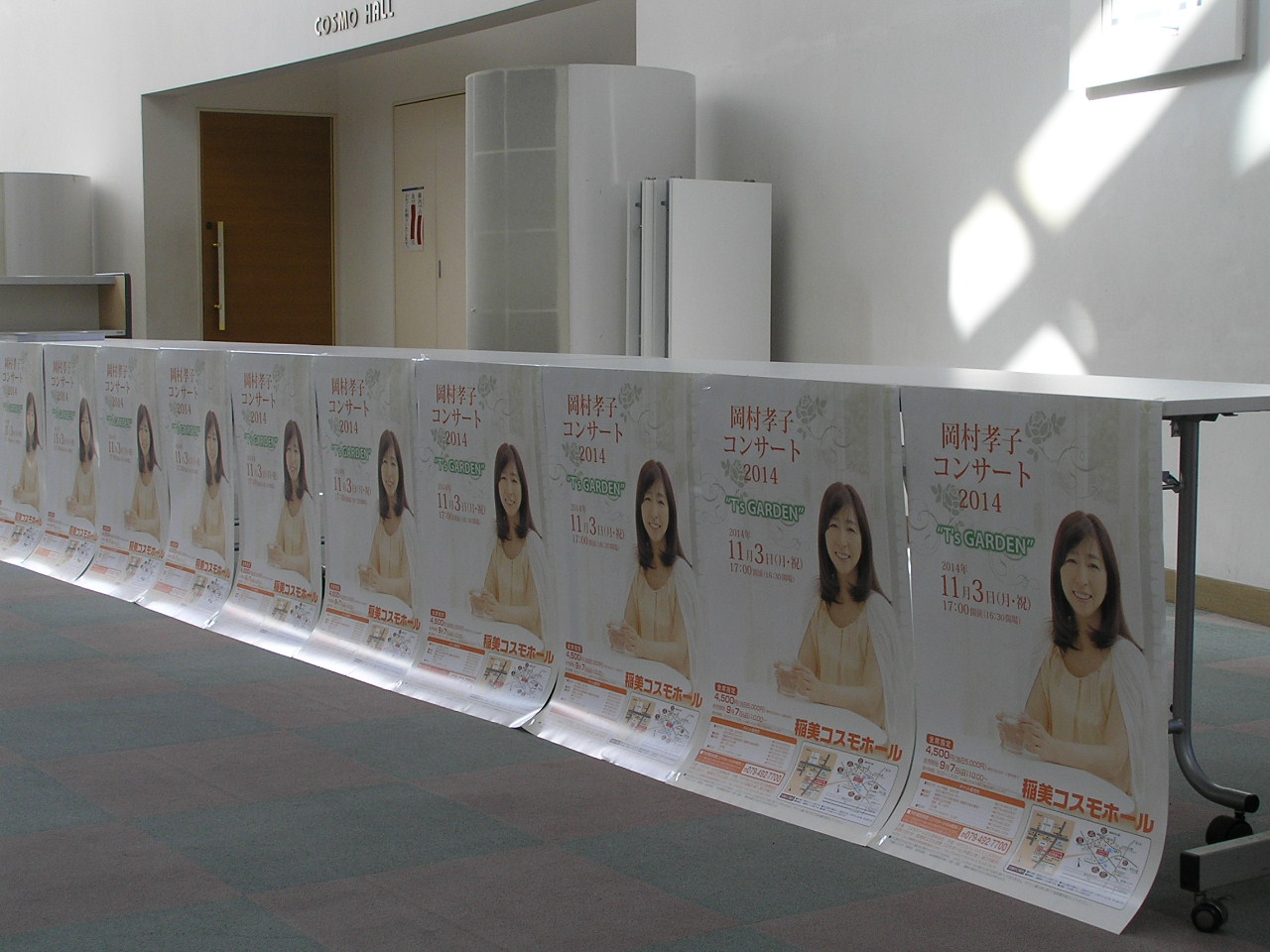 岡村孝子 2014/11/03 T's GARDEN 稲美町ライブ当日 前日までの雨もあがり、ライブ日和。この季節に相応しいのか、風も少し冷たかったが心は温かった。稲美の開館の周りの木々も色づき、秋模様。 何しろ今年の関西でのライブは無い、と思ってただけに、知ったその日から、孝子さんに感謝、感謝の毎日。まるで遠足前の小学生のように、毎日がウキウキ気分。それでも当日までの少しの波乱と、チケット販売日のドタバタは、やはり辛かった。しかし同志の温かい慰めの言葉などは、心に沁みました。 出待ちはたぶん難しいだろうとの助言が当たり、入り待ちの孝子さんは、日本人形のように可愛かった。ほんの数秒の出来事でした。 会場までの時間、ホール内や同志たちの記念撮影。その顔は芯から幸せそうな表情でした。ホールは『孝子さんに囲まれる』かの如く、ポスターの波でした。こんな力の入れようのホールは初めてでした。でもその隅に『当日券あり』の文字が、、、。 僕たちファンは、この孝子さんの笑顔に吸い寄せらるかのように、ここに集まり、心を一つにする。癒し、元気、未来への希望など得るために。そして各々心にある現実を、二時間でリセットするために。日々の辛苦も孝子さんの笑顔で全て許せるし、明日からも頑張れる。『ようこそ 稲美のまちへ 岡崎のふるさとに少し似てませんか(^_-)-☆』 ☆オーバーチャー 「白い夏」☆第1部 ♡1.夏の日の午後 ♡2.春色のメロディー ♡3.星空はいつも ♡4.ハレルヤ ♡5.一期一会 ~ようこそ、私の庭へ~ ♡6.感謝の気持ち ♡7.kiss☆第2部 ♡8.卒業 ♡9.私の空 ♡10.forever ♡11.晩春 ♡12.ポプラ ♡13.あなたにめぐりあう旅 ♡14.夢をあきらめないで ♡15.NO RAIN, NO RAINBOW ♡16.大切な人☆アンコール ♡17.ずっと ♡18.虹を追いかけて 孝子さんの熱い視線に遭い、再起不能です。 しばらく休養します(^v^) ひとこと、『私の空』聴けて最高 (*^^)v『Kiss』は手拍子なしが良いのにね (-。-)y-゜゜゜ 今日お会いした全ての人に感謝します。一期一会に感謝。『明日を夢見る心』を忘れさせずにいる孝子さんに、最高の感謝(^v^)追記 白いドレスの孝子さん、初めての地 稲美でやや緊張気味。でも最近定番の『始めての方アンケート』で8割と知って、孝子さんもファンも納得。でも旧来のファンとしては、嬉しいですね。ますます孝子さんのファンが増えるのですから(^-^)T's GARDEN 始めて良かったですね。お勧めして良かった、といつも思ってます。 また今回心強い同志とともに応援出来た事は、ここ数年続く想い出深いライブとなりました。最前列の席というのは病みつきになりますね。たまたまステージ上のモニターの前だったのですが、孝子さんがそこへ視線を送るたびに目が合いました(^v^)それ以外にも当然手は振り返して頂いたし、○○○にもしっかりと見詰めて頂けた(^_-)-☆満足満足の2時間でした。変なヤジもなく、手拍子も最低限で大人としての落ち着いた、それでいて全員で孝子さんをお迎えし、孝子さんとともにライブを創った、と感じました。 『Kiss』『私の空』はやはり感激モノ。 久々の『晩春』で、少しウルウル。 孝子さんの上京の地、東急沿線を放浪したのを思い出す。 『あなたにめぐりあう旅』では、見事に、指差しを外されました(^_-)-☆ この時、孝子さんの『意思』を感じた(^-^) 目の前までいらっしゃったのに、その瞬間やや左へ(-。-)y-゜゜゜ 『NO RAIN, NO RAINBOW』の前奏、 ライブでは孝子さんの後に神を見た、そんな尊厳さを感じました、 全般に孝子さん、楽しんでるな、って。 孝子さんにお逢いする事、孝子さんの作品にドップリ浸かる事。 そしてふだんあまり会う事はないけど、 同志とともに孝子さんを慕い、応援する快感を改めて味わいました。 『人生 山あり 谷あり』 『NO RAIN, NO RAINBOW』 PR