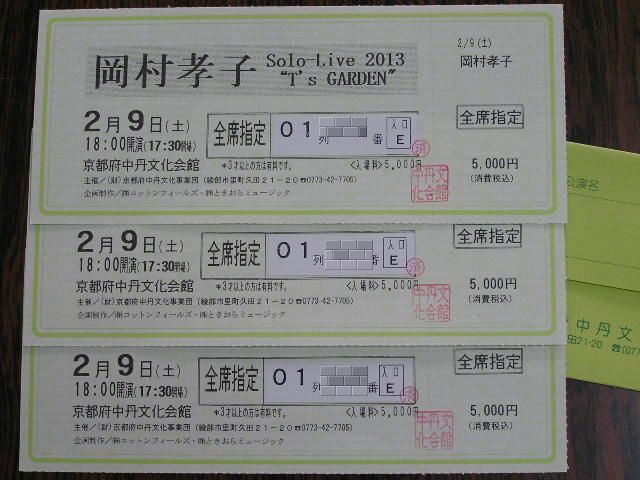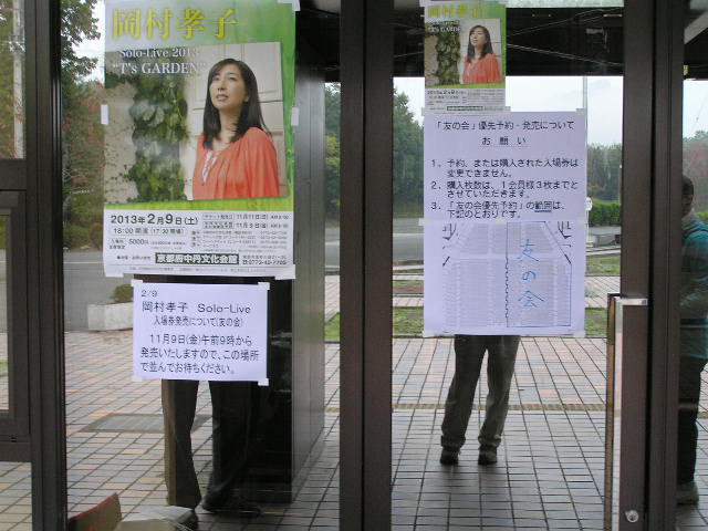 岡村孝子 2012/11/14 T's GARDEN 2013 綾部 でゲット (*^^)v 11月8日から9日にかけての事です。 来年2月の岡村孝子さんのライブチケットの前売り当日です。 少しでも前列席で孝子さんに再会したくて、前の日から行列参戦です。 あらゆる『事情』を済ませた。 その事で疲れがたまりとうとう風邪をひいてしまった。 全身ダルイし咳とともに頭痛が時々走った。 せっかくのまりもさんや、Tさんのご厚意にもここは答えようと、、、。 こんな機会は二度とない。 綾部に行く事により手にできるプラチナチケット。 ファンクラブや、電話やネットでは絶対手に出来ない。 じっとしている事が、罪悪でもあるような思いもあった。 当初はファンの方に『お任せ』だったのですが、 『前売り当日』が迫るに従い情緒不安定、とうとう自ら綾部の会場へと向かったのでした。 関東から遠征している方がいらっしゃるのに、指を咥えてじっとしていられなかったのです。 『しなくて後悔するより、して後悔』 そんな思いで、夜の闇の中へ。 21時前に自宅出発。 高速道利用でも地道でも距離的にそう変わらない。 夜明けまでに綾部に着けばいいのだが、夜間になるのも怖い。 2度の休憩をし、途中なぜか『交通検問』にも会いながら、 無事綾部駅前に到着。 1時前、走行距離118km。 かなり眠いが気が高場って、その上身体中痛い。 風邪と疲れのためだろう。 近場のコンビニで仮眠。 とうとう眠れなかった。 車で寝るというのは、所詮無理な話。 4時過ぎて会場へ行くと、Tさんがいた。 軽く挨拶、しばし孝子さん談義。 ここの会場の事を事細かく教わった。 夜が明けてファンは5名。 まりもさんの差し入れも嬉しかった。 9時の販売時に地元の方が来られで総勢10名程度か。 たつのの時より地元の人が少ないように思える。 9時の発売までに、『役所』とは思えない色んな体験をし、 ここの事務所の人たちの仕事への意気込みを感じた。 孝子さんのライブはこの写真のホールで行わるのだが、 一方チケット販売の公民館では、 色んな催しが毎日のように行われているという。 公共の建物で、このようなものは珍しいのではないだろうか。 たぶんここの人たちの努力と、笑顔の対応の賜物だと感じました。 左側の建物がその公民館。 発売までの1時間、 『事務員』との楽しいひと時を過ごしました。 冗談とも本気とも思えないやり取りが、 この綾部の人の温かさを感じました。 ただ予約の取り方が不満でした。 ファンクラブは仕方ないのですが、 左側の座席は2日のちの11月11日のためのものだと訊いて、 それまでの思いは吹っ飛びました。 何のための『会員前売り』なのか、と。 かといって、11日に出直す元気など無かった。 最前列席に巡り合えた、という事だけでもこの上ない幸せ者である。 夏の一番暑い頃に知り、、 今まさに紅葉のこの時期にチケットを手にし、 2月の綾部で雪の中ライブ。 我ながらファンとはすごいものだ(*^^)v と改めて感じる。 関東から来られたというお二人には、 それでも足元にも及ばないのですが。 この紅葉も散った頃には大阪で、年一度のお祭り、 『クリスマス ピクニック』 今年はどんな夢の時間をファンに魅せて頂けるのでしょうか(^v^) 孝子さん、貴女の魅力って、すごい(*^。^*) 片道100km 時間3時間で手にしたチケット。 Tさんとまりもさんのご厚意で手にしたクリスマスプレゼント。 たぶんこんなにツイテイル事なんてもうないだろう。 その反動なのか頭痛が治らない。 風邪の末期か、、、。 自宅に帰ると配達証明が、、、。 年末のCPライブのチケットだった。 予想通り隅っこだった。 これも含め手にしたライブチケット3枚。 やはり『幸運は自ら手にするもの』という事なんだろう。 チケット獲得に関し、ご協力頂いた方々や、 ご心配、ご配慮頂いた方々に御礼申し上げます。 ありがとうございました。 PR