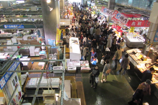 | 移動中幸い雨に降られずに唐戸市場へ。昨日と違い昼食時間は都会並みの混雑。人気店は長蛇の列。 |