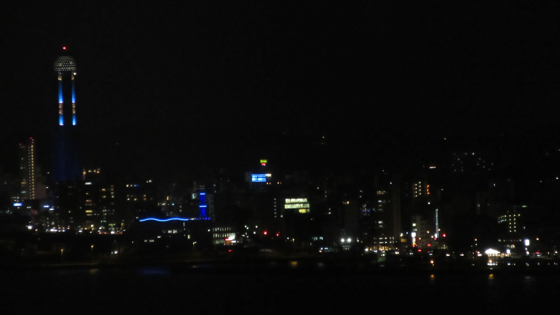| 宵闇が迫り港の見える『門司港レトロ展望台』31階103mで、海峡を挟んで下関や大橋も見渡せます。 |