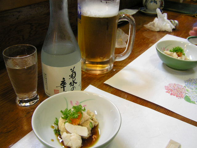 岡村孝子 2014/06/22 ライブ以外の想い出 その2 先ほどまでのライブ後の興奮と、出待ちでの孝子さんとの出来事を噛みしめながら、五島のそよ風に吹かれ『呑屋』へ急いだ。ネットで予約できる時代に、ややアナログ的な出来事があった今回の店選び。3番目にヒットした小ぢんまりとした居酒屋にした。坂道を5分ほどの所にあり、カウンターのみで5~6人しか座れない。ゆっくり呑むにはもってこいである。ここから宿へのタクシーの予約も済ませてるので、時間を気にせず呑める。五島の美味しいモノ、、、との期待でこの五島へやって来て、やっとその思いが達成できる。孝子さんのライブと美味しいモノの旅とは、この上ない幸せ。 カウンターに着き、メニューを見て、ビックリ。『時価』の文字が半数もある。とりあえず冷酒とビールの定番で、目はメニューにくぎ付け。恐る恐る『大将』に料理を注文する。この時、事前の情報不足を悔やまれた。『禁漁中』の言葉や『取り扱ってない』の言葉に、『裏メニュー』も期待したが,それも甘い考えだった。ここまで来て、なんだ。わが身の詰めの甘さを反省、悔しさを覚えた。それでも隣の席の人が、『ハコフグ』がお勧めだとの事で、即注文する。店内を見回しても、食べ物はあまり期待できない。旅立ち前に期待したものは、ない。五島牛 ステーキにて食するが、期待はずれ(-。-)y-゜゜゜ハコフグ 思ってたものと違う。 まあ期待が大きすぎた。五島豚 取り扱いなし。島さざなみ 取り扱いなし。アワビ ウチワエビ 時価で注文する勇気なし。 その他期待していた物の成果。五島うどん かんころ餅 埠頭などで土産として購入。ソフトクリーム 全く思いもしなかった。水平線に沈む夕陽 くもり空で無理でした。雨でなく幸いです。青い海と白い砂浜 瀬戸内育ちのせいか、特別印象に残らなかった 結局刺身の盛合せと、つくね位しか身分にあうものはなかった。料理以上に『大将』と盛り上がって話したのだが、やや自棄酒気味で、何を話したかは覚えていない。ただ楽しく五島の夜が過ごせた事は、確かである。地元の人との語らいも、旅の想い出である。 11時にタクシーが店先に着き、その店を後にした。島内の某所に消えた(^-^) 続くのかな(^v^) PR