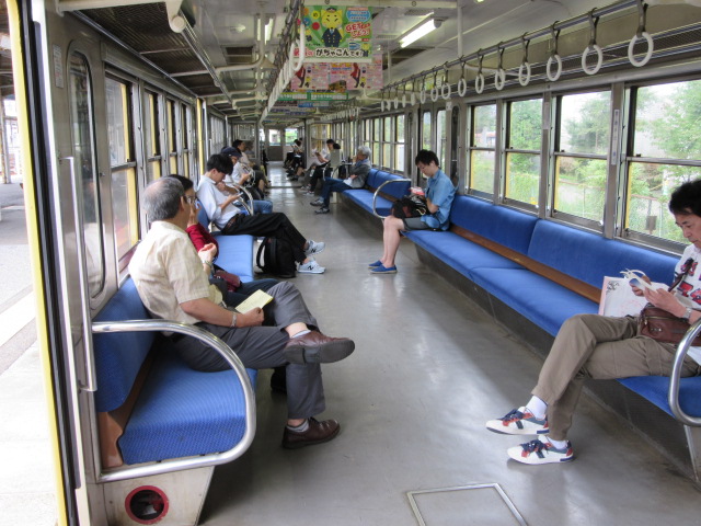 | 座っているのは地元の人達。 数分したら隣駅。 10数分で今回の目的地『新八日市』です。 |