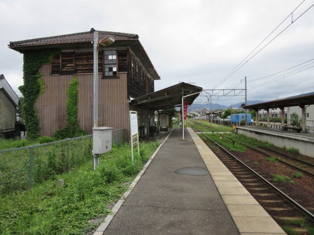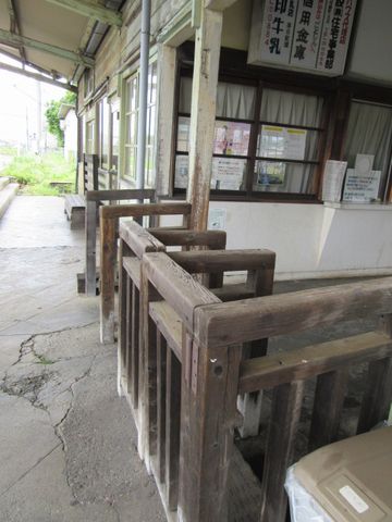 | 過ってはここに駅員さんが立ち、 切符のチェックや観光案内もしていたのでしょうか。 古びた雰囲気を無理やり創ってる観光地もありますが、 新八日市駅はこの建屋が出来た当時そのままのようです。 柱の傷や越年の風雪に傷んだ箇所もそのままです。 ここだけが、昔の趣のまま、時が止まってる。 |