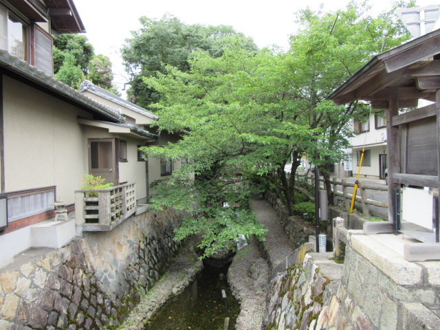 | 途中細い路地のようなところを迷い込み、 偶然辿り着いた川沿いの小道。 涼しげな風が、少し汗ばんだ身体には快かったです。 あとでわかったのですが、左の建物は清水神社です。 |