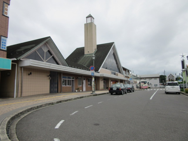 | 木造二階建ての『新八日市』の駅舎全景です。 雰囲気ありますね(^_-)-☆ 今回この写真撮りたくて、ここに降りました(^_-)-☆ 駅前広場といっても何にもありません。 |
