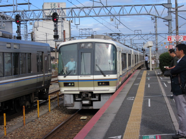 | いつもの駅のいつもの快速電車で、 新快速始発の姫路へ移動。 最初の乗り換え駅、近江八幡まで、 2時間のんびり電車の旅です。 始発からゆっくり座って、車窓の風景を楽しみます。 途中の明石から京都まで満席で、行楽客で車内はザワザワ。 |