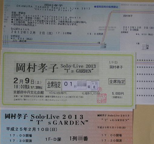岡村孝子 2012/11/14 T's GARDEN 2013 綾部 でゲット (*^^)v 11月8日から9日にかけての事です。 来年2月の岡村孝子さんのライブチケットの前売り当日です。 少しでも前列席で孝子さんに再会したくて、前の日から行列参戦です。 あらゆる『事情』を済ませた。 その事で疲れがたまりとうとう風邪をひいてしまった。 全身ダルイし咳とともに頭痛が時々走った。 せっかくのまりもさんや、Tさんのご厚意にもここは答えようと、、、。 こんな機会は二度とない。 綾部に行く事により手にできるプラチナチケット。 ファンクラブや、電話やネットでは絶対手に出来ない。 じっとしている事が、罪悪でもあるような思いもあった。 当初はファンの方に『お任せ』だったのですが、 『前売り当日』が迫るに従い情緒不安定、とうとう自ら綾部の会場へと向かったのでした。 関東から遠征している方がいらっしゃるのに、指を咥えてじっとしていられなかったのです。 『しなくて後悔するより、して後悔』 そんな思いで、夜の闇の中へ。 21時前に自宅出発。 高速道利用でも地道でも距離的にそう変わらない。 夜明けまでに綾部に着けばいいのだが、夜間になるのも怖い。 2度の休憩をし、途中なぜか『交通検問』にも会いながら、 無事綾部駅前に到着。 1時前、走行距離118km。 かなり眠いが気が高場って、その上身体中痛い。 風邪と疲れのためだろう。 近場のコンビニで仮眠。 とうとう眠れなかった。 車で寝るというのは、所詮無理な話。 4時過ぎて会場へ行くと、Tさんがいた。 軽く挨拶、しばし孝子さん談義。 ここの会場の事を事細かく教わった。 夜が明けてファンは5名。 まりもさんの差し入れも嬉しかった。 9時の販売時に地元の方が来られで総勢10名程度か。 たつのの時より地元の人が少ないように思える。 9時の発売までに、『役所』とは思えない色んな体験をし、 ここの事務所の人たちの仕事への意気込みを感じた。 孝子さんのライブはこの写真のホールで行わるのだが、 一方チケット販売の公民館では、 色んな催しが毎日のように行われているという。 公共の建物で、このようなものは珍しいのではないだろうか。 たぶんここの人たちの努力と、笑顔の対応の賜物だと感じました。 左側の建物がその公民館。 発売までの1時間、 『事務員』との楽しいひと時を過ごしました。 冗談とも本気とも思えないやり取りが、 この綾部の人の温かさを感じました。 ただ予約の取り方が不満でした。 ファンクラブは仕方ないのですが、 左側の座席は2日のちの11月11日のためのものだと訊いて、 それまでの思いは吹っ飛びました。 何のための『会員前売り』なのか、と。 かといって、11日に出直す元気など無かった。 最前列席に巡り合えた、という事だけでもこの上ない幸せ者である。 夏の一番暑い頃に知り、、 今まさに紅葉のこの時期にチケットを手にし、 2月の綾部で雪の中ライブ。 我ながらファンとはすごいものだ(*^^)v と改めて感じる。 関東から来られたというお二人には、 それでも足元にも及ばないのですが。 この紅葉も散った頃には大阪で、年一度のお祭り、 『クリスマス ピクニック』 今年はどんな夢の時間をファンに魅せて頂けるのでしょうか(^v^) 孝子さん、貴女の魅力って、すごい(*^。^*) 片道100km 時間3時間で手にしたチケット。 Tさんとまりもさんのご厚意で手にしたクリスマスプレゼント。 たぶんこんなにツイテイル事なんてもうないだろう。 その反動なのか頭痛が治らない。 風邪の末期か、、、。 自宅に帰ると配達証明が、、、。 年末のCPライブのチケットだった。 予想通り隅っこだった。 これも含め手にしたライブチケット3枚。 やはり『幸運は自ら手にするもの』という事なんだろう。 チケット獲得に関し、ご協力頂いた方々や、 ご心配、ご配慮頂いた方々に御礼申し上げます。 ありがとうございました。 PR